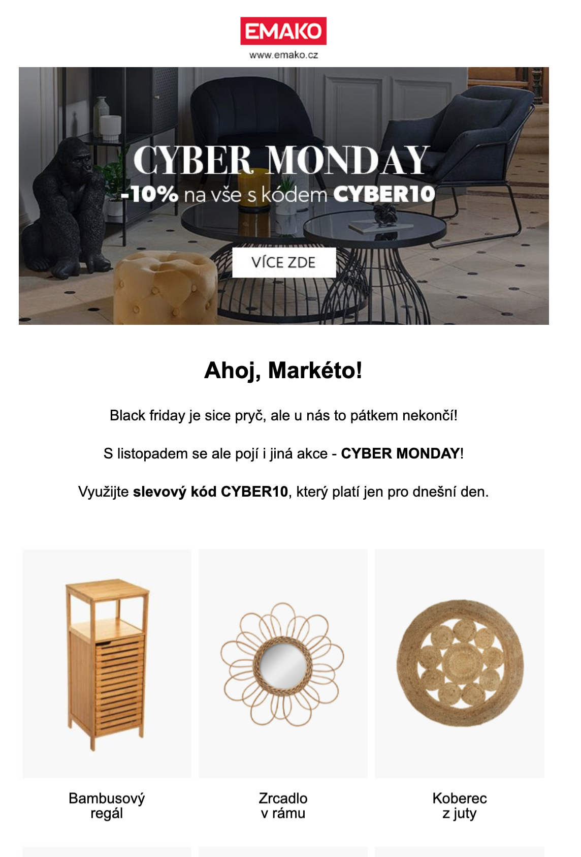 V Leadhubu jsme zjistili, že v roce 2023 se na Cyber Monday poslalo o polovinu e-mailů méně na Black Friday. Zdá se, že v Čechách není tak populární jako v zahraničí. I přesto, ale tento den vytváří příležitost nabídnout zákazníkům zajímavou slevu a motivovat je k nákupu. Třeba to zrovna vám zafunguje.