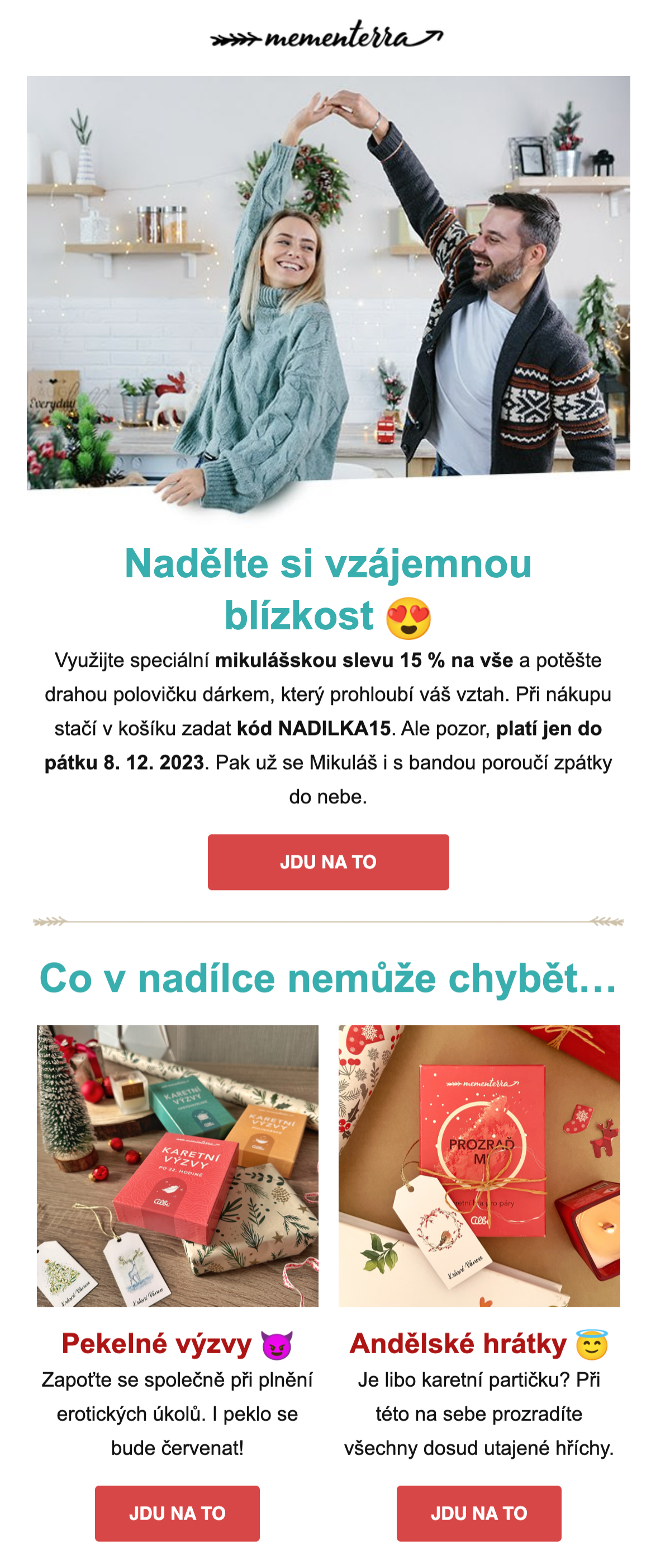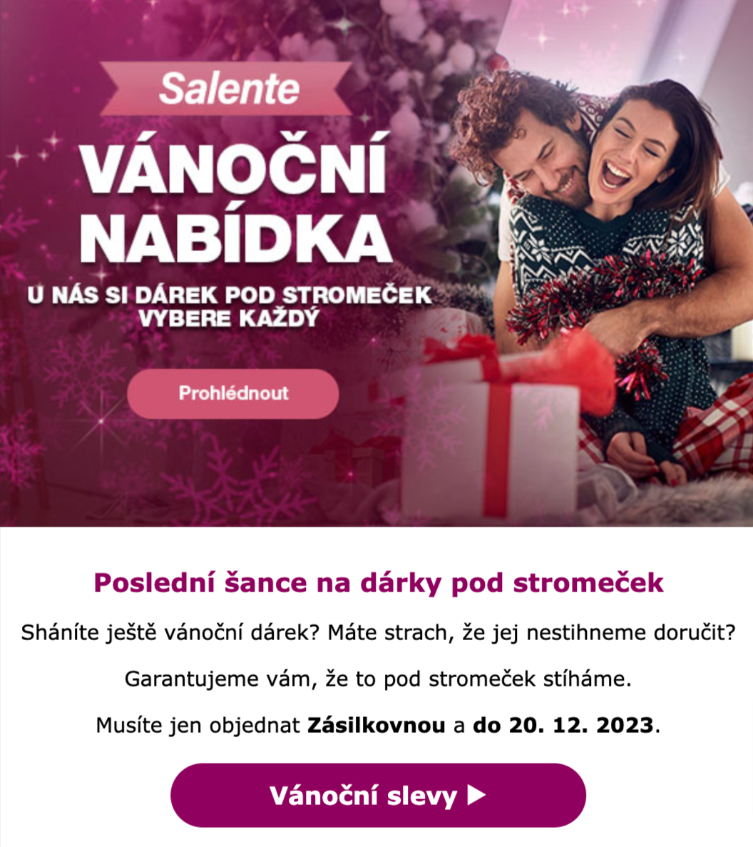 A v neposlední řadě – jedna z nejkrásnějších částí roku – vánoční čas. Lidé začínají shánět dárky s předstihem, ale i na poslední chvíli. V prosinci se naše schránky zaplavují e-maily s tipy na vánoční dárky. Možná si říkáte, že to nebude fungovat, když jsou mailboxy odběratelů doslova přehlcené, ale naopak. Stále to funguje a mnozí zákazníci ve skutečnosti čekají na vánoční newslettery.