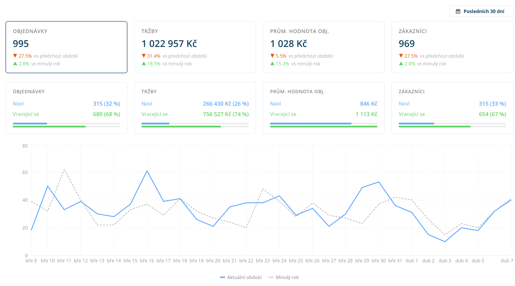 Tržby, objednávky i zákazníci – vždy s porovnáním předchozího období i stejného období minulého roku. Vidíte trend, rozložení objednávek podle dne a hodiny i podíl nových vs. vracejících se zákazníků.