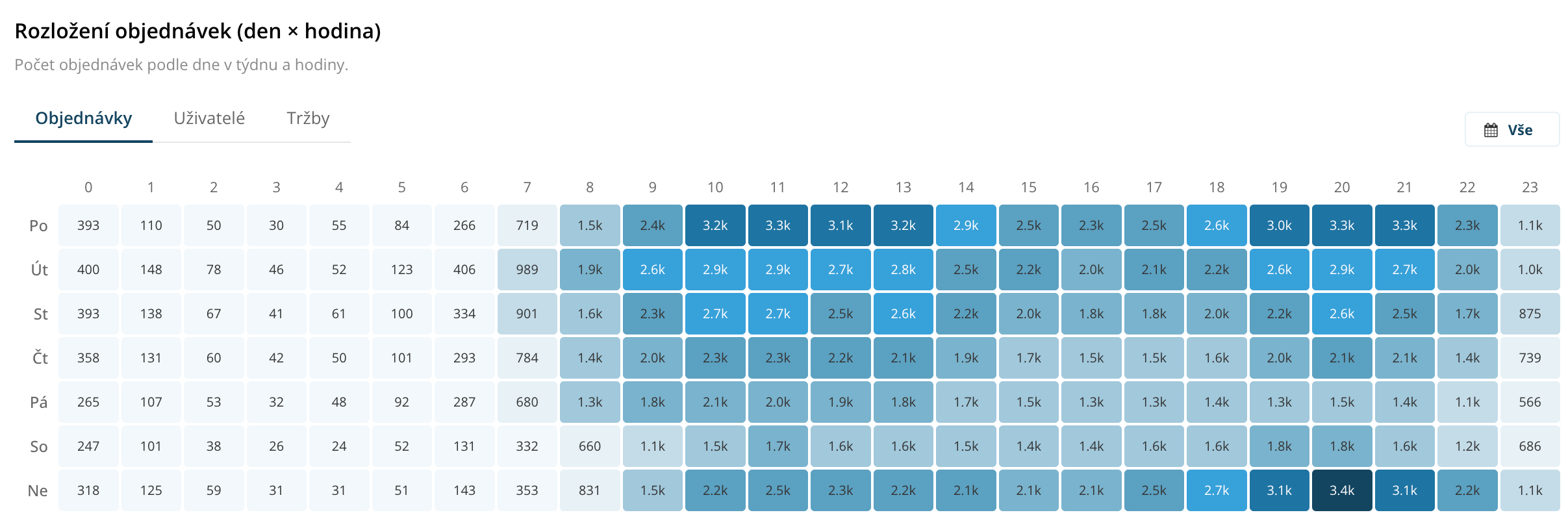 Z dat uvidíte, že k nejsilnějším dnům patří například pondělí dopoledne a neděle večer. Právě na tyto dny naplánujete marketingové aktivity – nebo naopak využijete data k tomu, abyste podpořili prodeje ve slabších dnech. Pomůže vám to i s načasováním větších akcí, jako je třeba nightshopping.