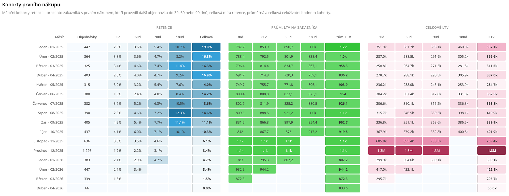 Zákazníci jsou rozděleni do skupin podle měsíce prvního nákupu. U každé skupiny vidíte, kolik procent se vrátilo v daném časovém okně a jak se jejich průměrná hodnota v čase vyvíjí.