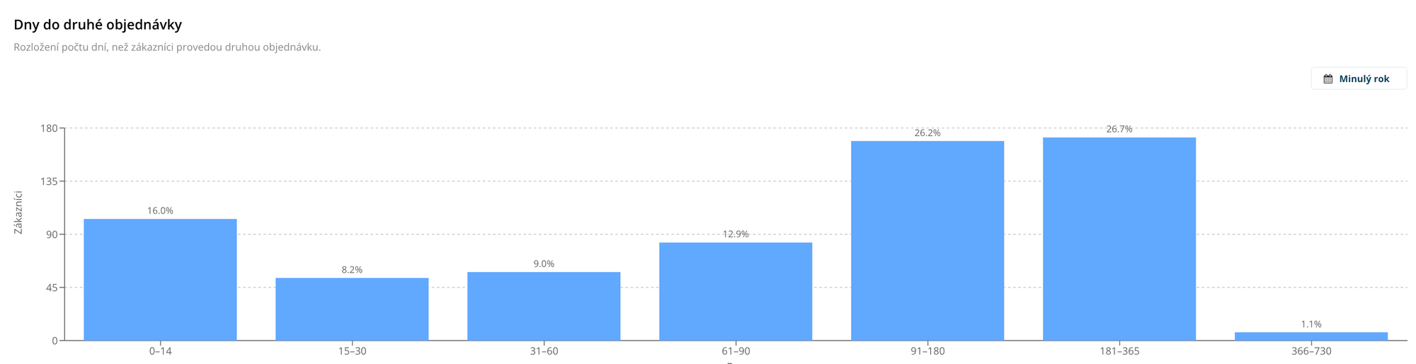 Druhý pohled na retenci ukazuje, jak dlouho zákazníkům trvá provést druhou objednávku. Graf rozloží zákazníky do časových pásem – například kolik procent z nich nakoupilo znovu do 14 dní, do 30 dní nebo až po roce.