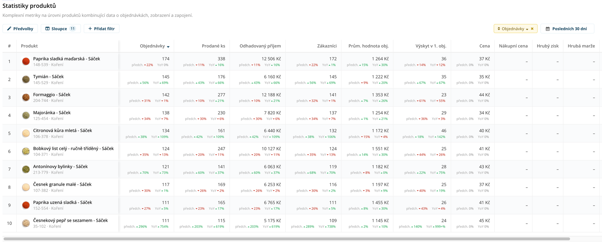Produkty seřadíte podle libovolného sloupce – nejprodávanější, nejprohlíženější nebo nejziskovější. Přidejte filtr na kategorii nebo značku a získáte stejný pohled pro konkrétní část sortimentu.