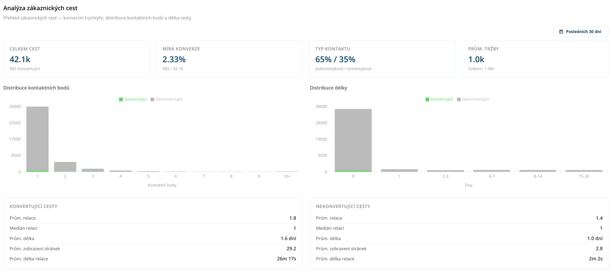 Přehled zdrojů návštěvnosti, zákaznických cest i toho, jak zákazníci přecházejí mezi kanály. Vidíte cestu, která vedla k nákupu – i tu, která k nákupu nevedla, a jak dlouho trvala.