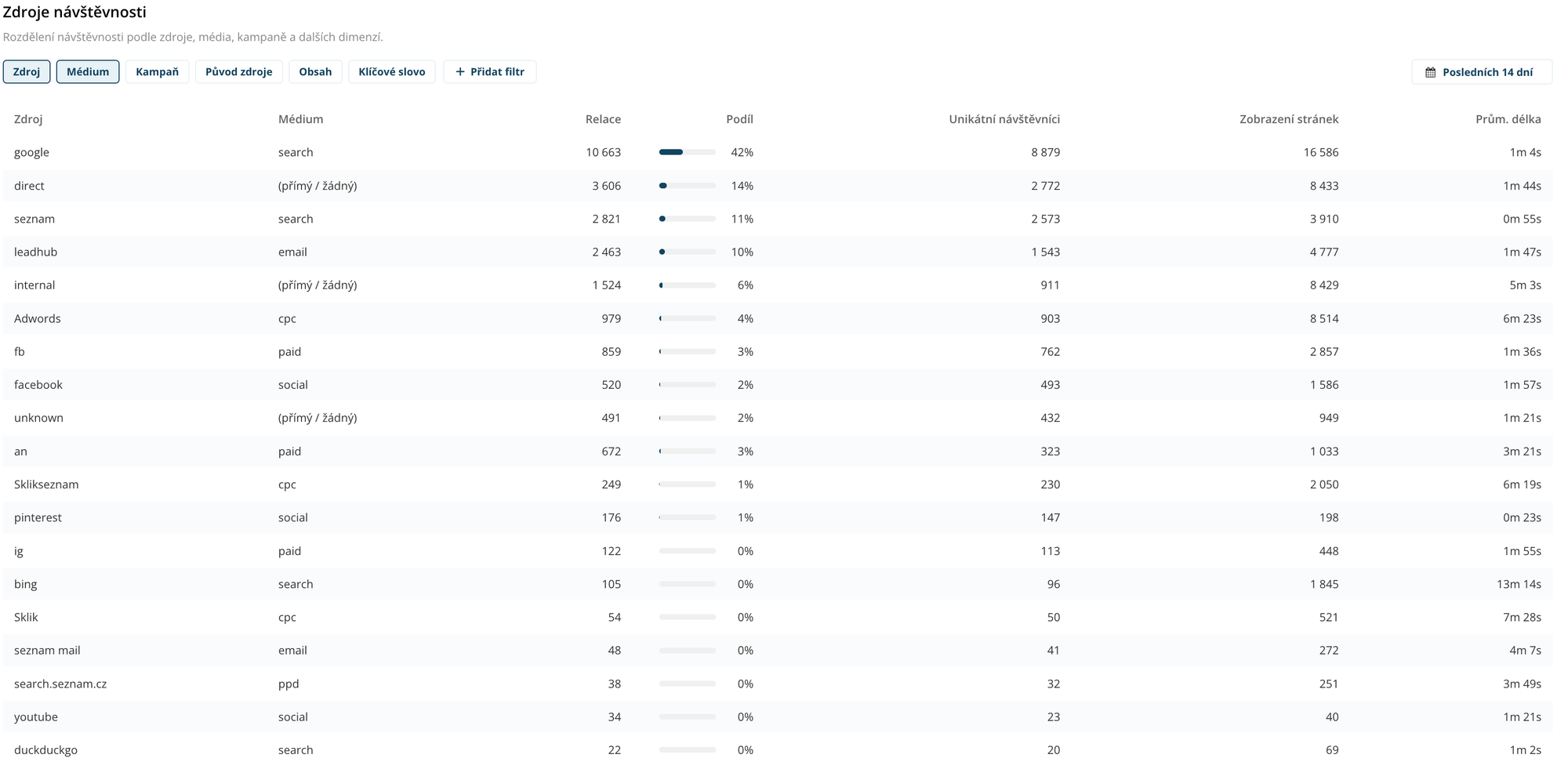 Na jednom místě vidíte zdroje návštěvnosti, které si můžete libovolně filtrovat.