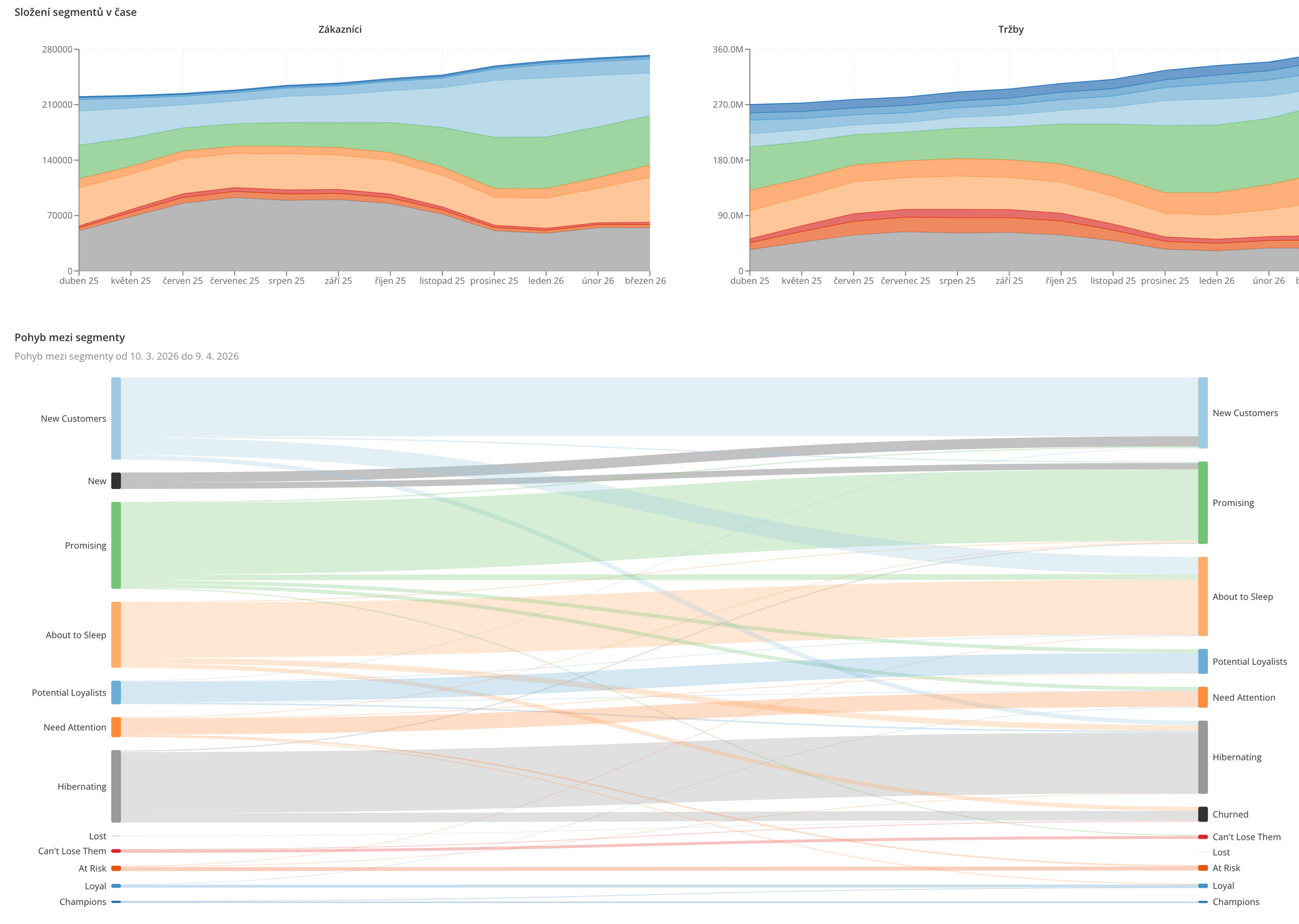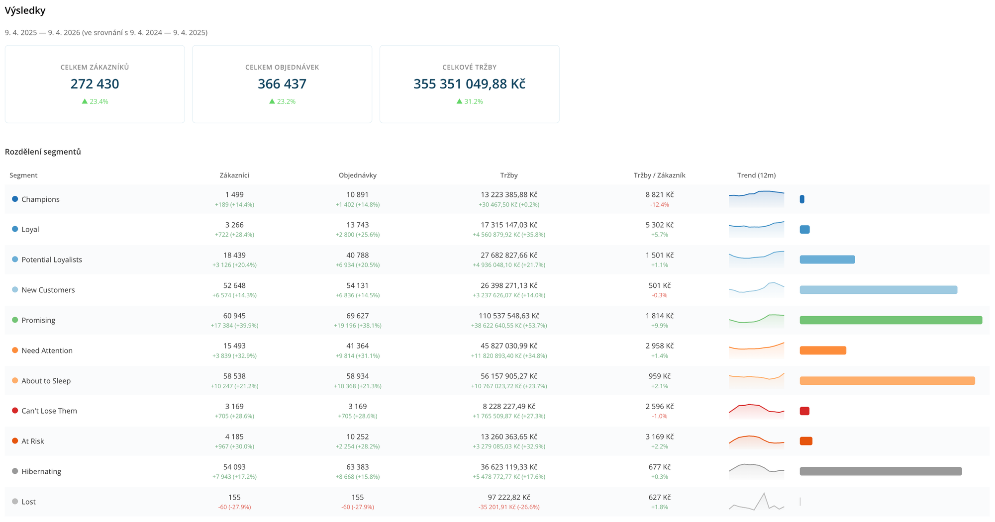 Přesně vidíte, kdo jsou vaši nejcennější zákazníci, kdo potřebuje pozornost a kdo je na odchodu. Podle toho spustíte správnou automatizaci.