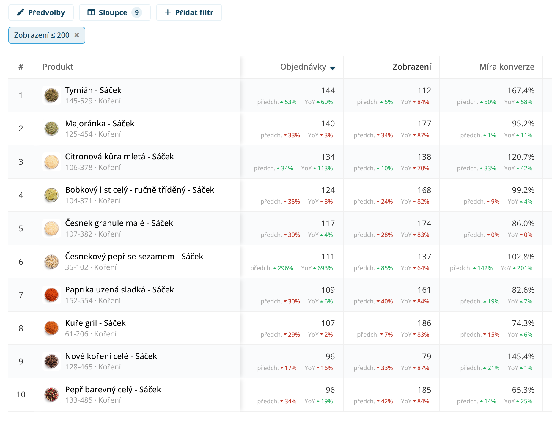 ▪ Skryté příležitosti – málo zobrazení, ale vysoká konverze. Produkty, které konvertují skvěle, přestože je málokdo vidí. Stojí za to podpořit je v reklamě i e-mailingu nebo je lépe zviditelnit na webu.