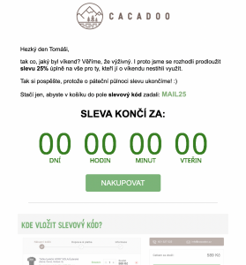 “tak co, jaký byl víkend? Věříme, že výživný.” – a takhle Cacadoo prodlužuje víkendovou slevovou akci. Čtenář vašich e-mailů se nemusí popadat za břicho u každé věty. Občas stačí decentní oživení, které vám udělá obrovskou službu.