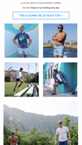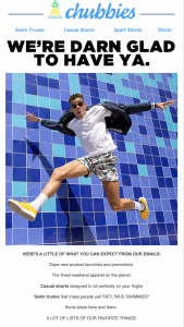 Chubbies svůj uvítací e-mail neodflákli. Nechybí informace, legrace, produkty a celková reprezentace brandu. A mimochodem, očekávání je naplněno 😉