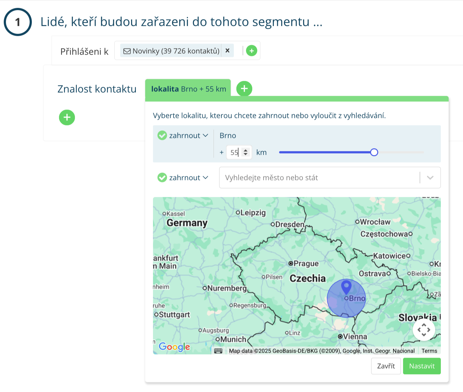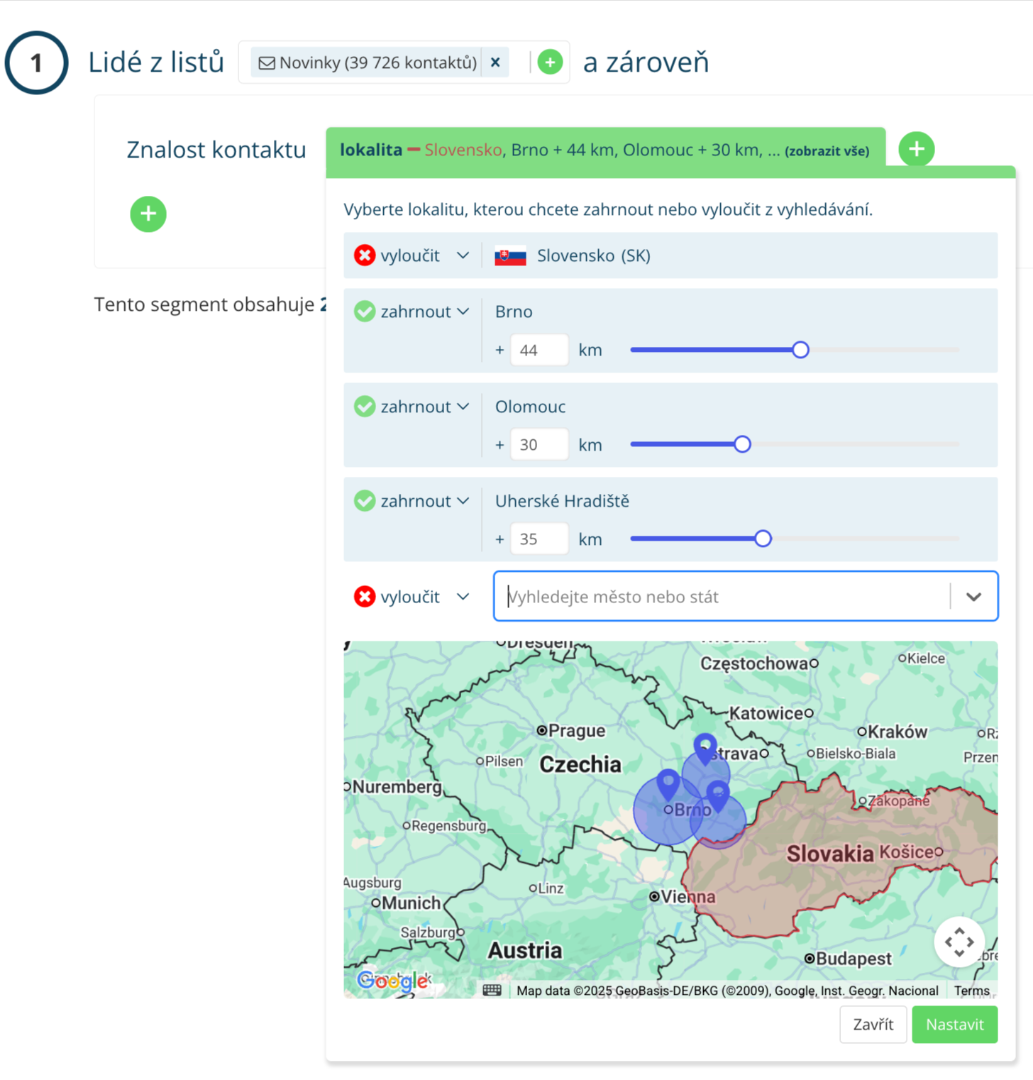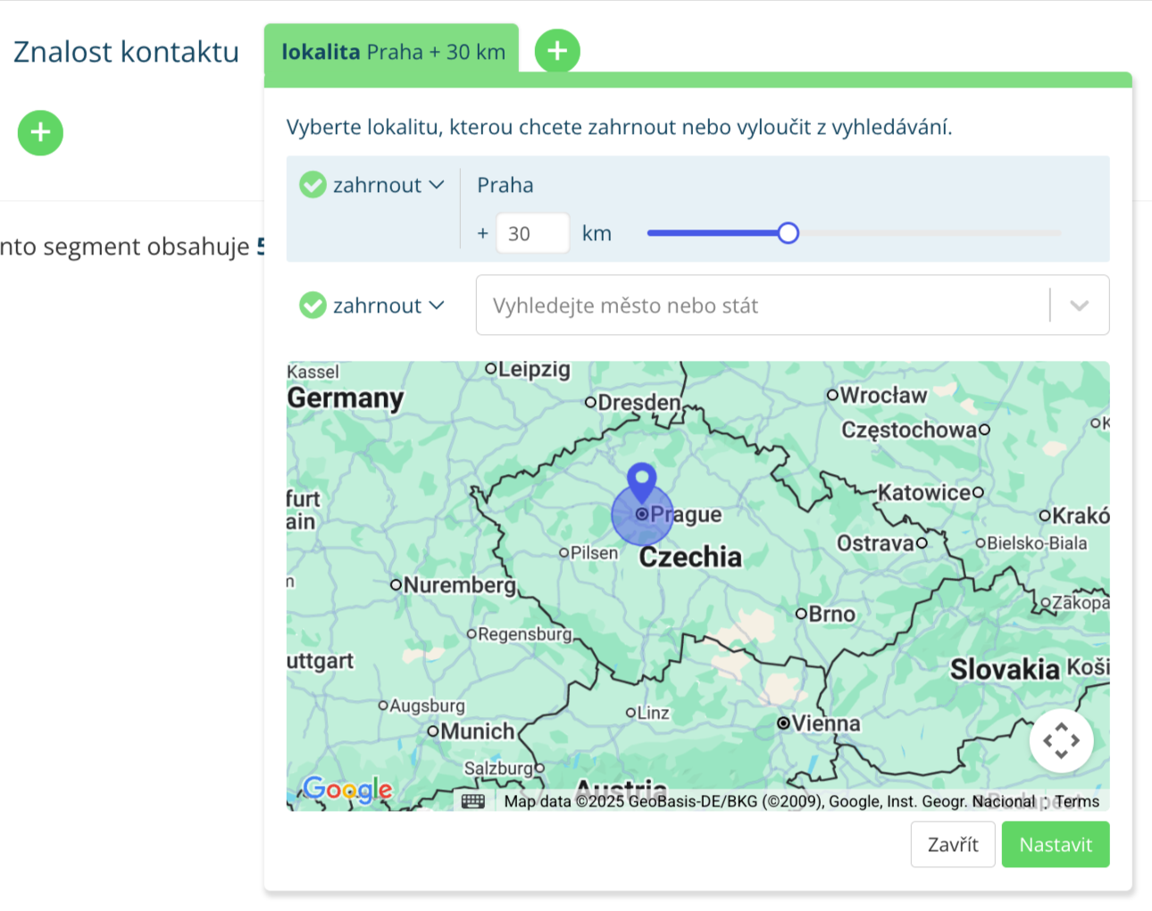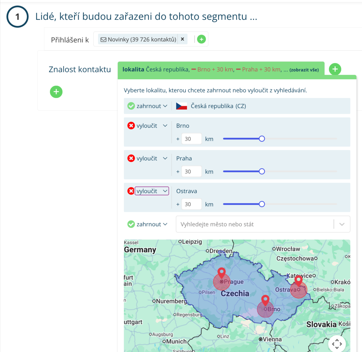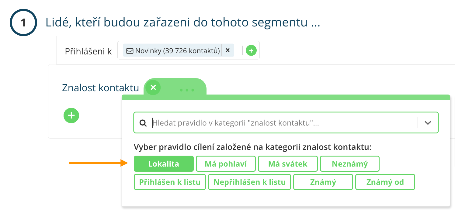 V Leadhubu jednoduše zadáte stát, město nebo kraj s rozmezím vzdálenosti, na která chcete cílit nebo je naopak z cílení vyloučit. V rámci segmentačních pravidel vyberte „Znalost kontaktu – Lokalita“.