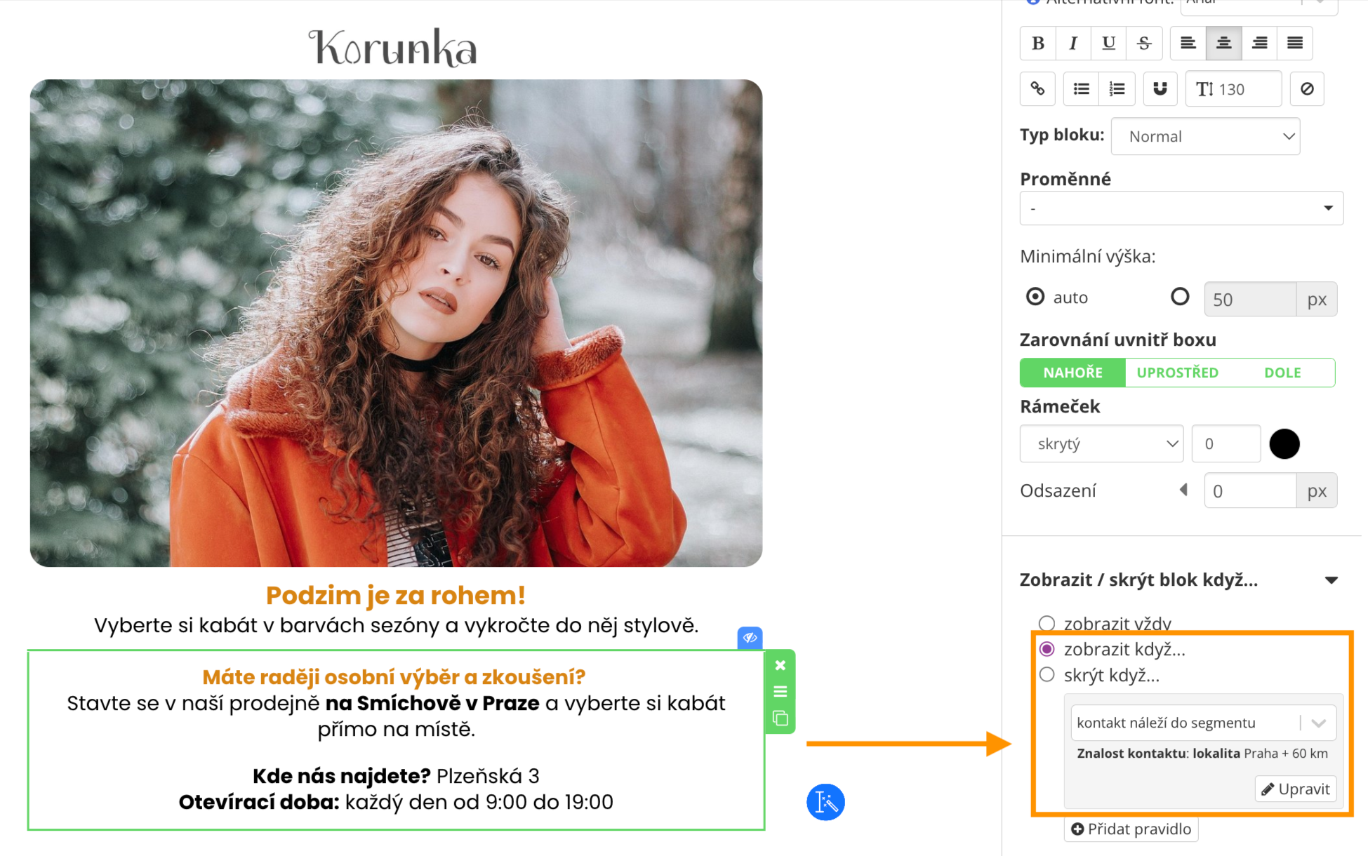 Díky tomu připravíte jeden univerzální e-mail, ale každému příjemci se zobrazí obsah na míru – například blok s prodejnou uvidí jen lidé z Prahy a okolí.