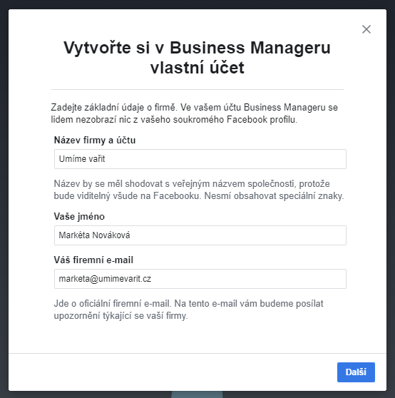 Dialogové okno pro vytvoření účtu v Business Manageru