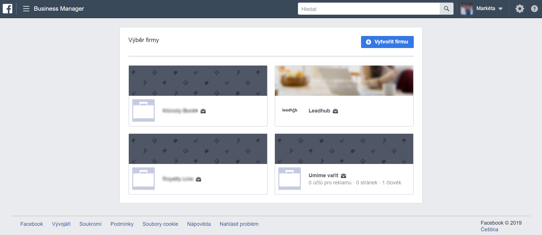Po přihlášení do Business Manageru se na hlavní stránce zobrazí všechny firmy, které máte se svým soukromým účtem spojené. Vyberte účet, který chcete propojit s firemním profilem, a poté postupujte dle následujících kroků.