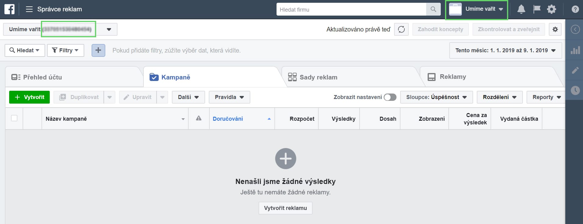 Pokud chcete přidat váš již vytvořený účet do Business Manageru, bude třeba si připravit ID stávajícího účtu pro reklamy. ID účtu najdete v menu v levém horním rohu v záložce Vytváření a správa –> Správce reklam.