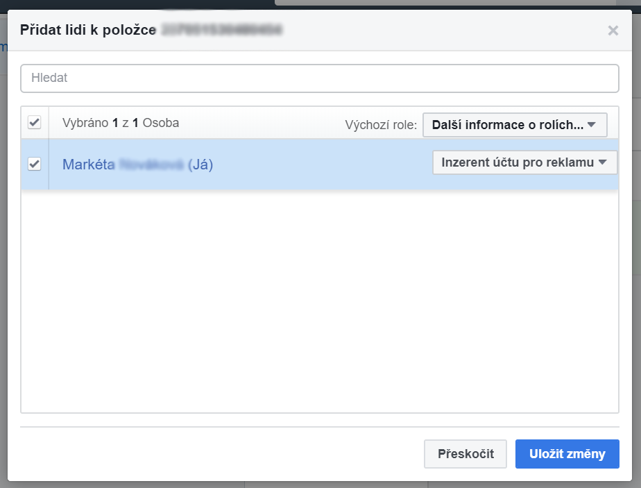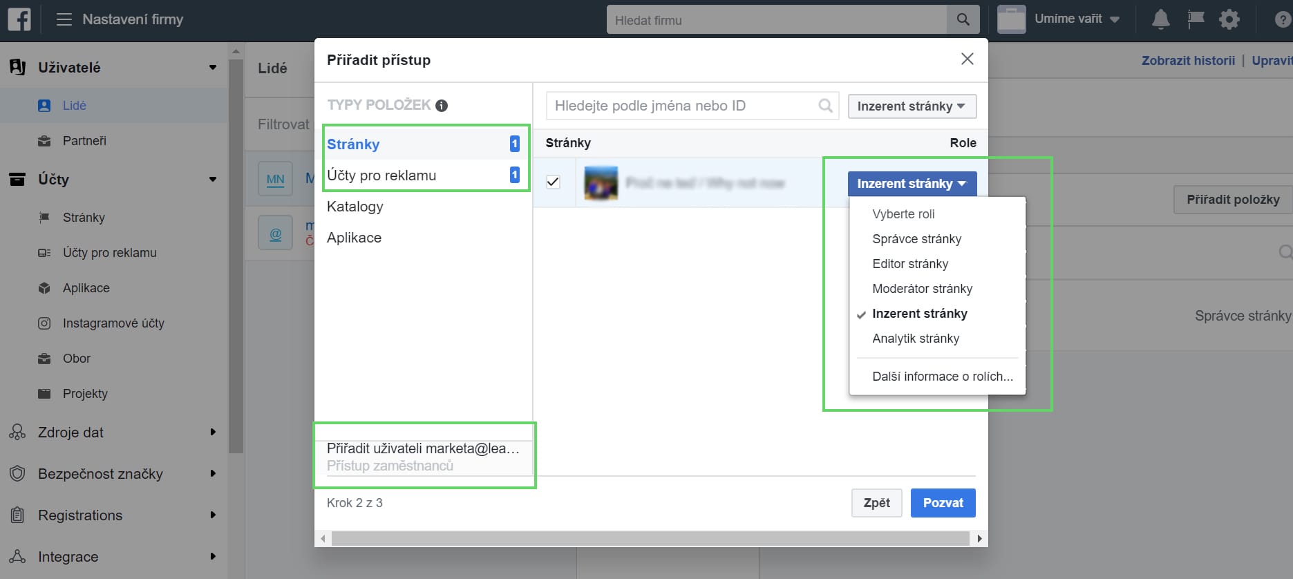 - V dalším kroku přidělíte rolím oprávnění pro správu stránky a reklamního účtu. Poté se kontaktům odešle pozvánka na zadaný e-mail. Tu musí pouze potvrdit a budou automaticky přidání do Business Manageru.