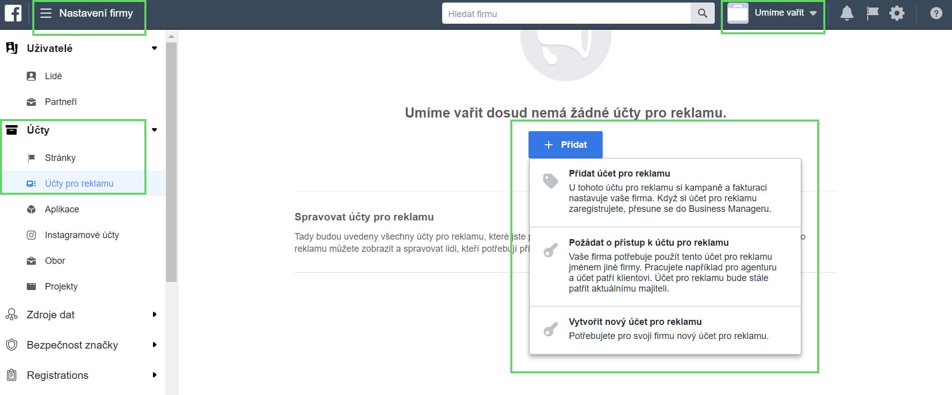 1. V záložce Nastavení firmy vyberte položku Účty –> Účty pro reklamu –> Přidat účet pro reklamu.