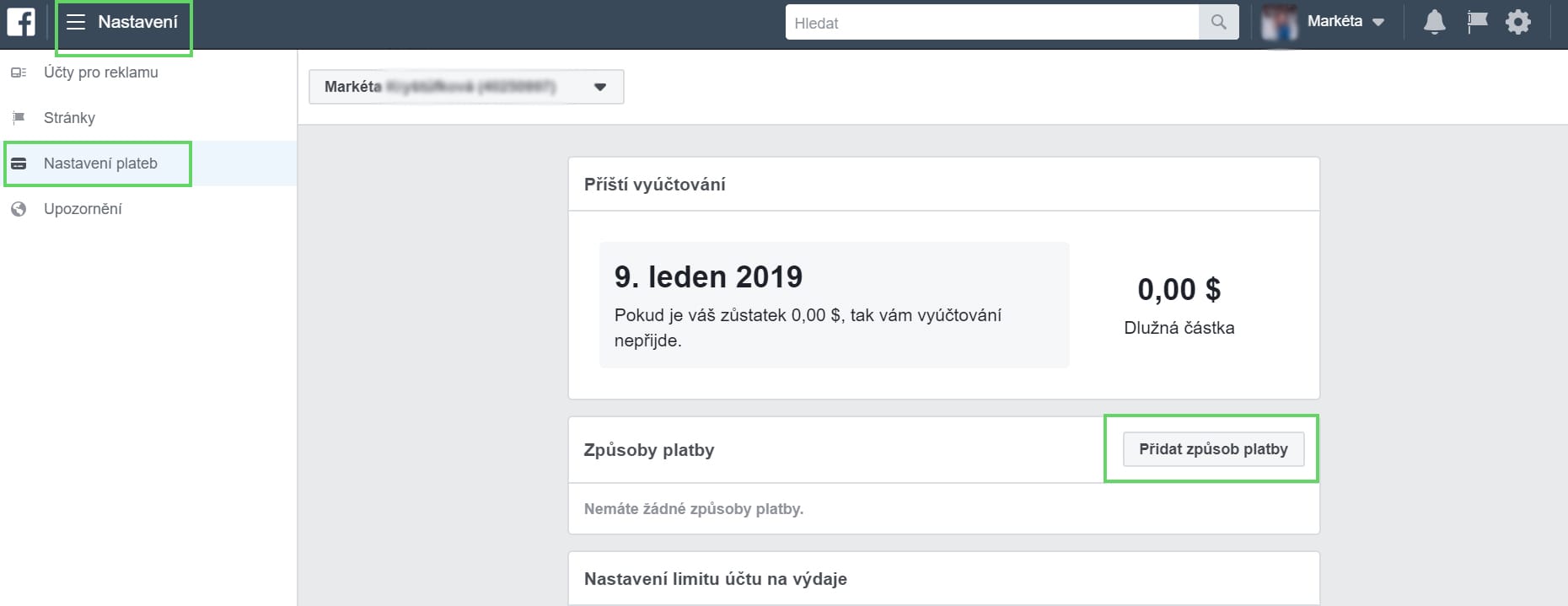 2. Způsob platby vyberete v Nastavení –> Nastavení plateb a Přidat způsob platby, kde v dialogovém okně vyplníte platební údaje a vyberete platební metodu. Facebook vám bude automaticky strhávat částky z účtu a fakturovat je zpětně.