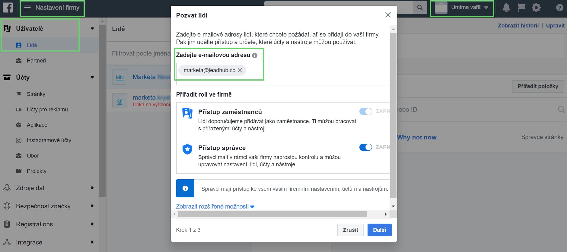 Přidání dalších osob do Business Manageru