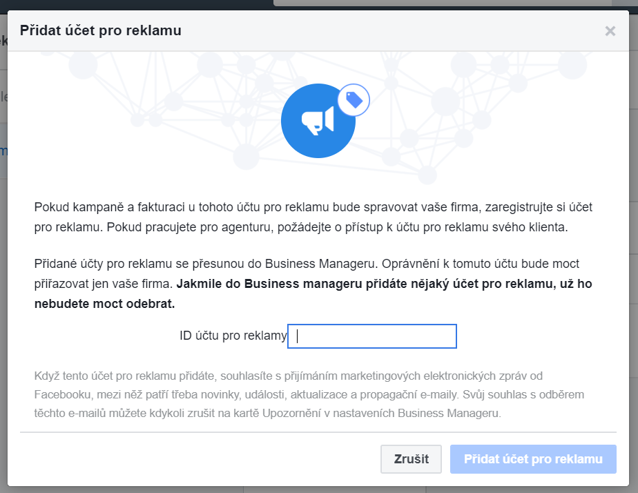 2. Do dialogového okna vložte ID stávajícího účtu pro reklamu a pomocí konfirmačního tlačítka účet přidejte.