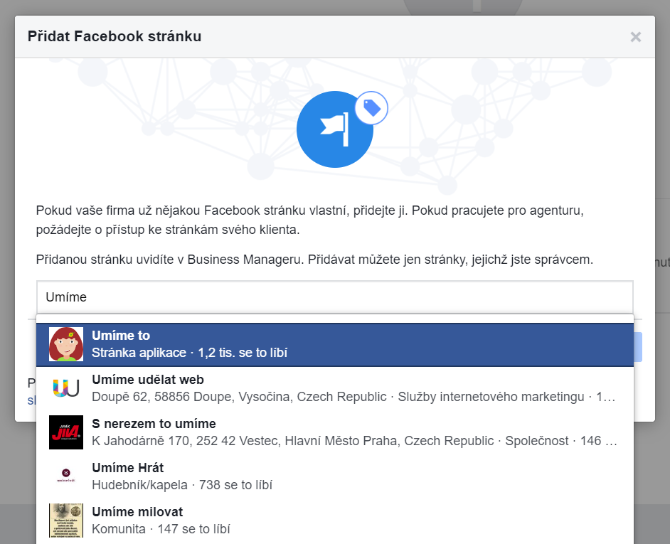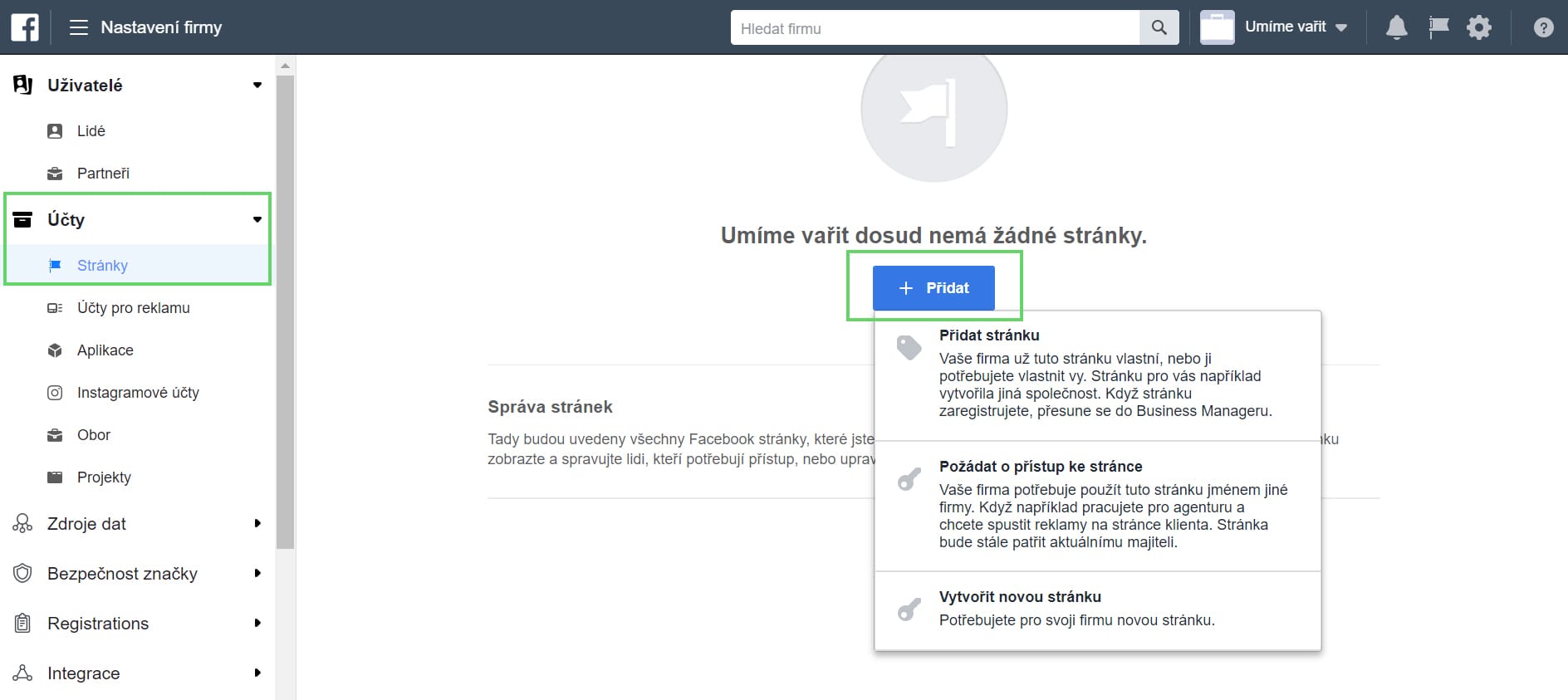 Všechny firemní stránky, které chcete spravovat, musíte přidat do Business Manageru.