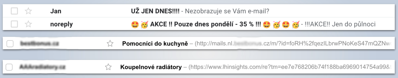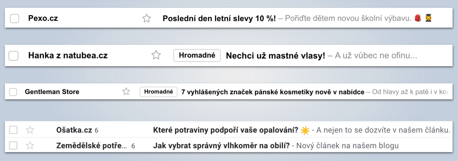 E-mailové schránky jsou denně naplněny hromadou e-mailů. Móda, hubnutí, zájezdy, kosmetika, slevy, víkendové akce, novinky, TOP nabídky. Jak může uspět v takové záplavě zrovna váš e-mail? Čtěte dál, protože vám prozradíme, jak pomoci prvnímu dojmu vašich e-mailů v inboxech a open rate.