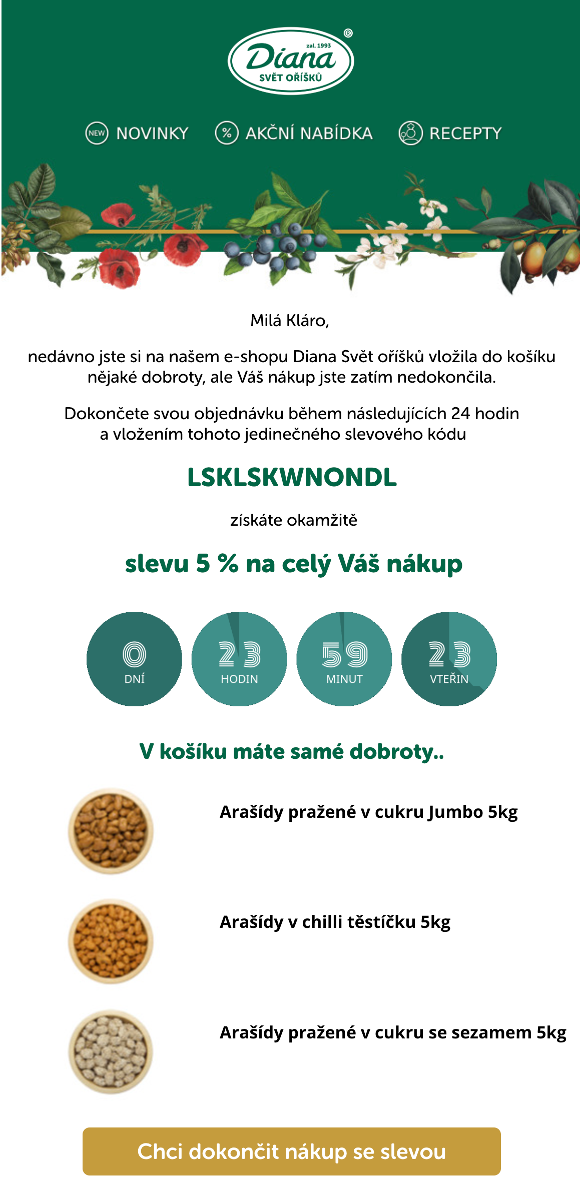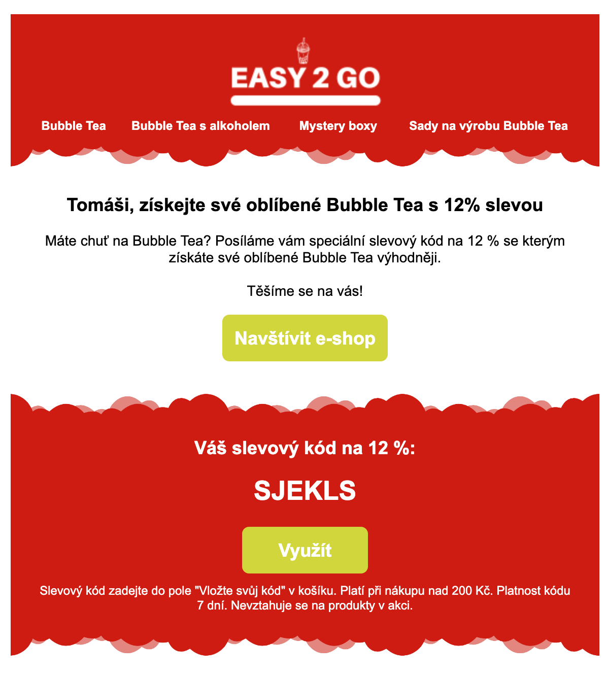 Stejně tak lze automaticky vložit slevový kód – rovnou z e-mailu. Kód bude samozřejmě aplikován pouze za předpokladu, že splňuje jeho nastavené parametry. V této nápovědě najdete, jak tuto funkcionalitu nastavit.