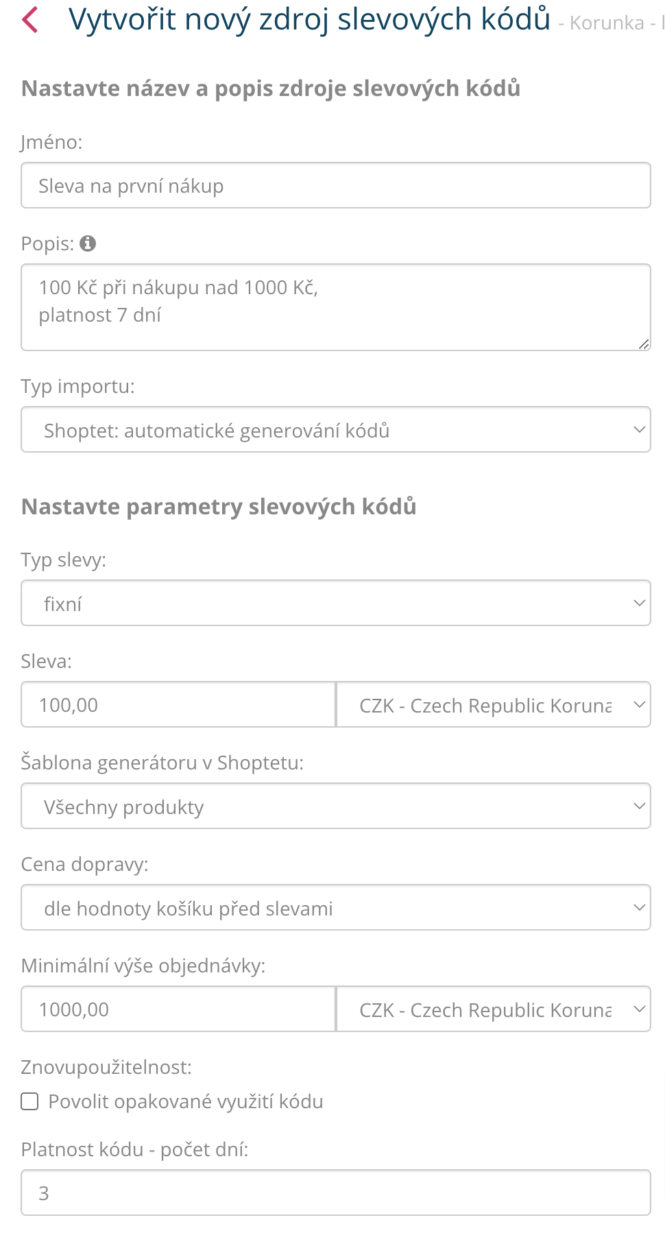 Jelikož je naše aplikace napojené přes API na slevový modul Shoptetu, stačí pár kliky nastavit parametry slevového kódu a pak už se nemusíte o nic starat.