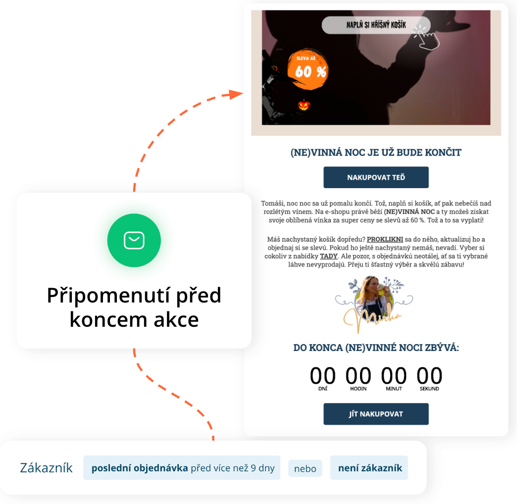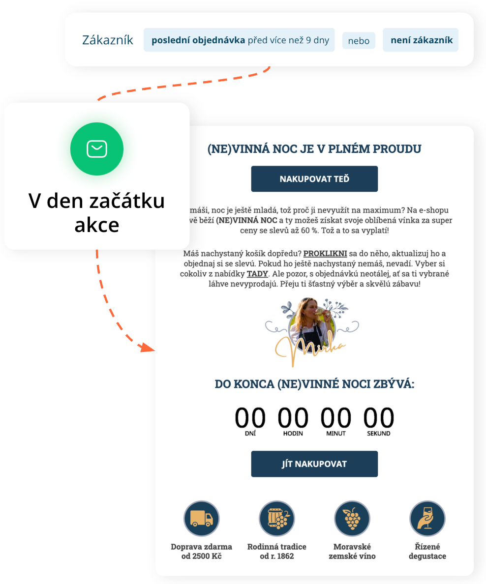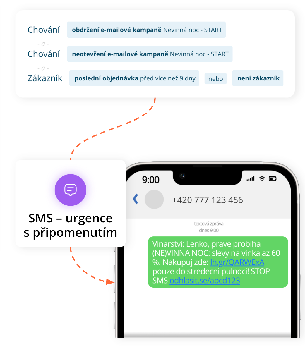 Zákazník může nejprve dostat e-mail s nabídkou. Pokud ho neotevře (např. po několika dnech), následuje připomínka. Aktivnějším nebo VIP zákazníkům může přijít SMS s časově omezenou nabídkou, například krátce před ukončením akce.