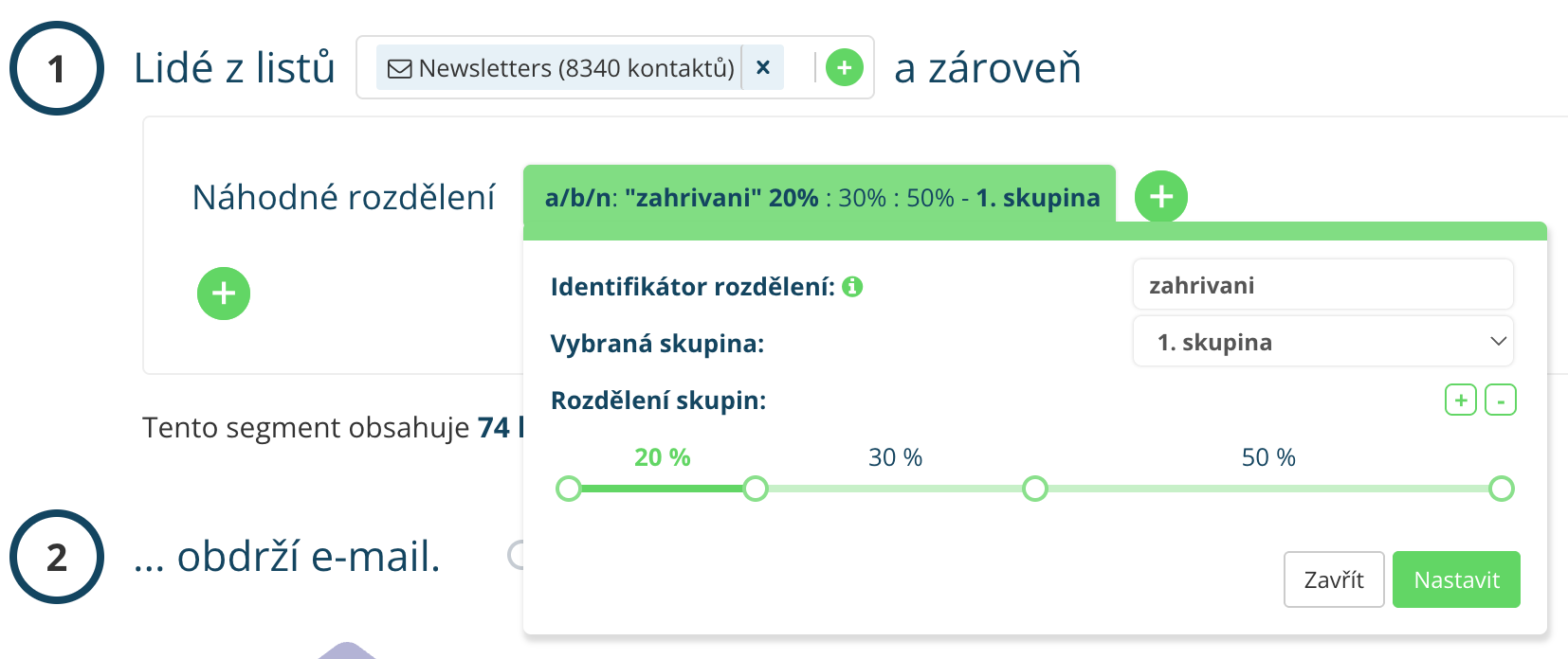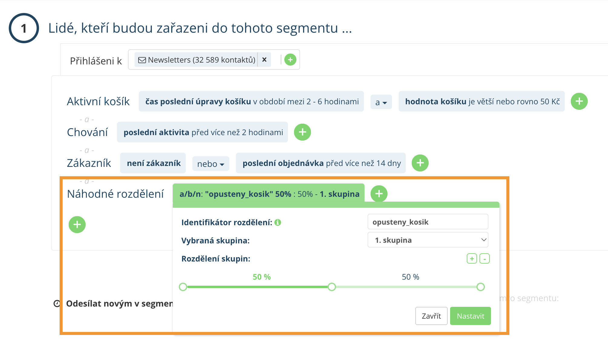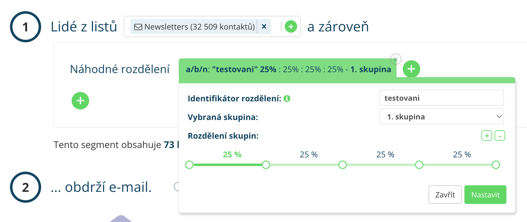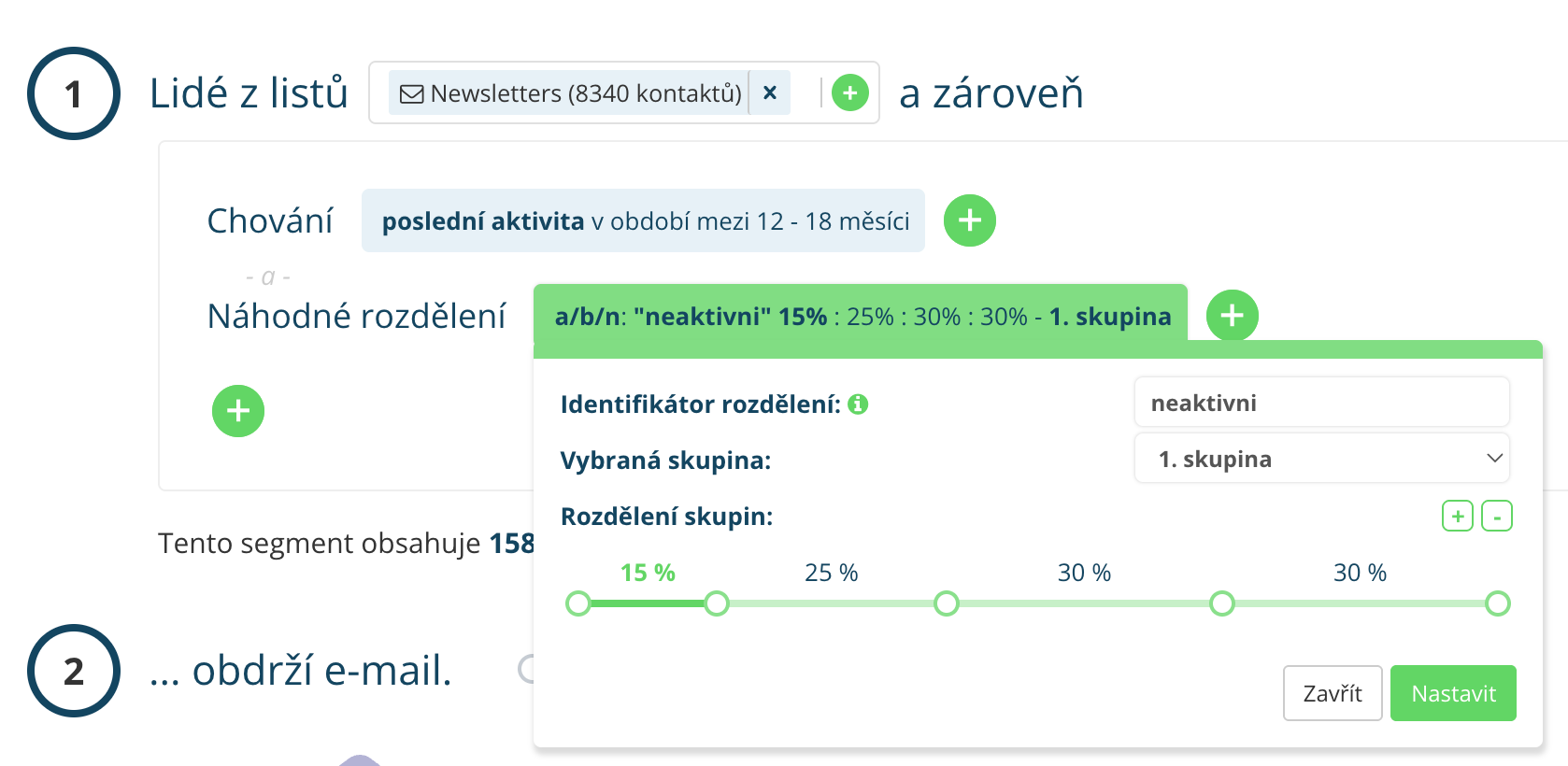 Díky segmentačnímu pravidlu „Náhodné rozdělení“ můžete neaktivní odběratele oslovovat postupně, kontrolovaně a ve vlnách. To znamená, že sdělení nejprve odešlete například 15 % méně aktivního publika. Podle toho, jak tato skupina zareaguje, postupně přidáváte další část segmentu. Pokud jsou výsledky dobré, můžete e-mail následně odeslat i zbytku publika.