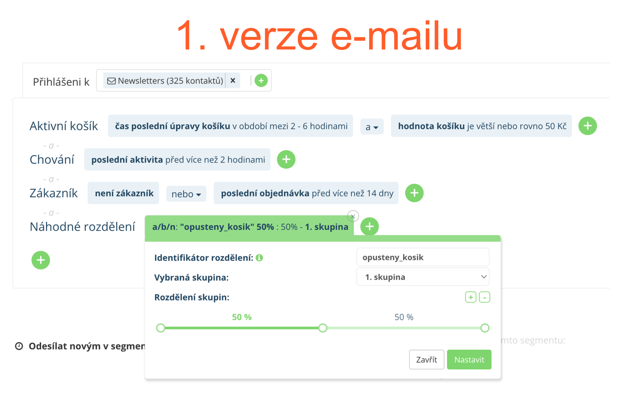 Pro testování dvou verzí e-mailu kampaně Opuštěný košík by nastavení mohlo vypadat například takto: