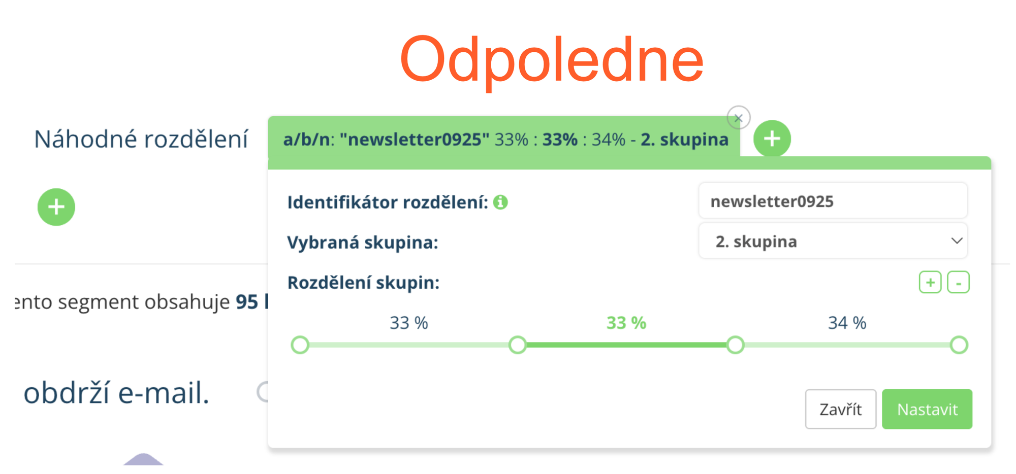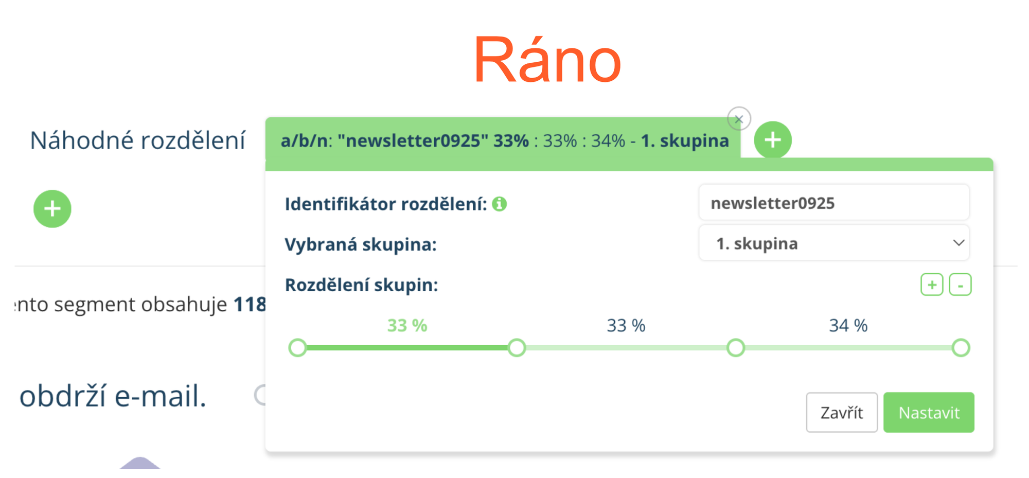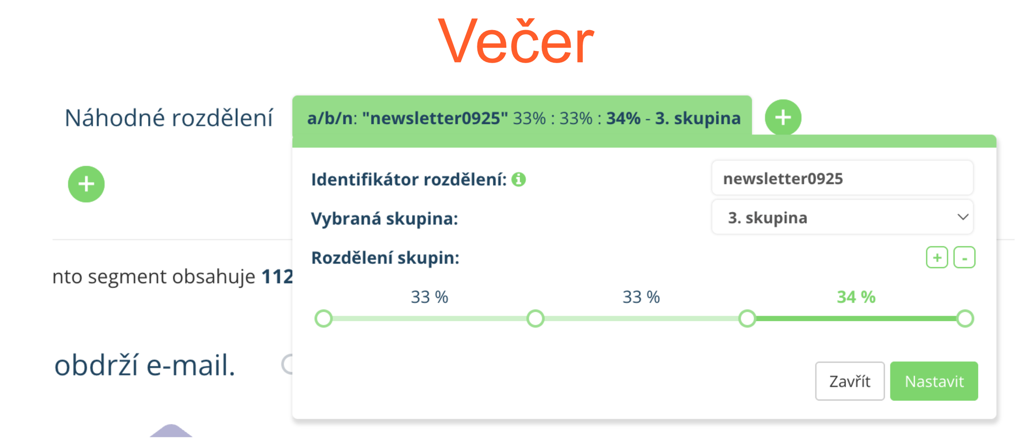 Díky segmentačnímu pravidlu „Náhodné rozdělení“ to snadno otestujete. Jednoduše rozdělíte cílový segment například do tří stejně velkých skupin a každé z nich odešlete newsletter v jinou dobu.