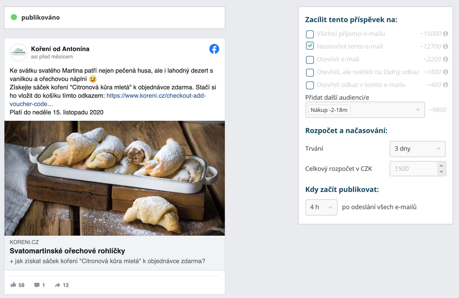 Využijte možnosti propojit e-mail marketingový nástroj se sociálními sítěmi. Zacilte shodné sdělení newsletteru na ty, co ho neotevřeli nebo z něj neproklikli.