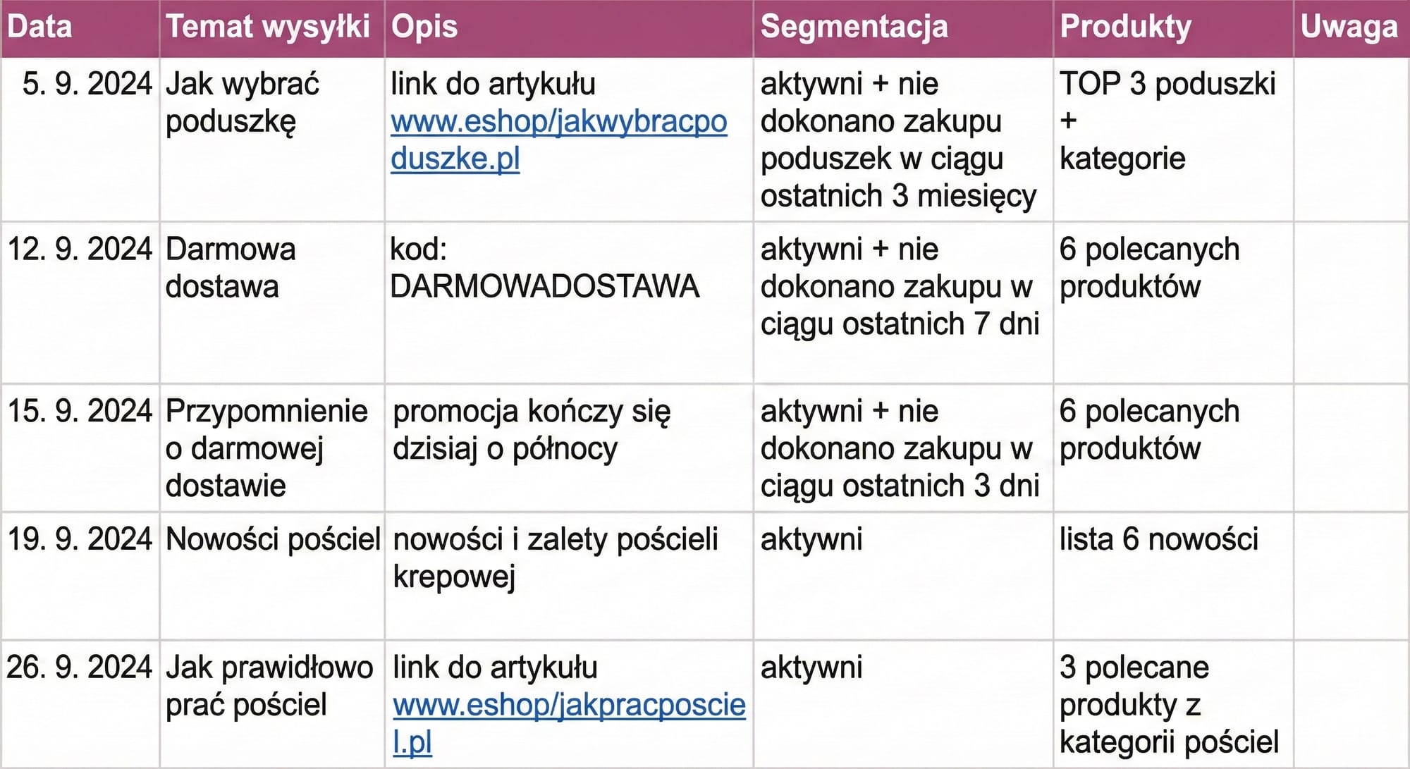- sezonowe okazje marketingowe (Black Friday, Walentynki, Boże Narodzenie, pierwszy dzień szkoły, Halloween, Dzień Kobiet, Dzień Dziecka itd.).