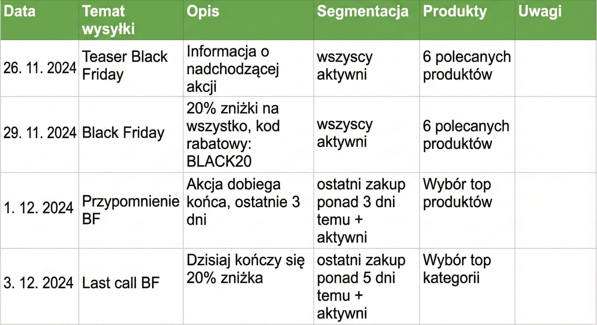Taki przegląd pozwoli Ci planować z wyprzedzeniem, przygotować grafiki i treści oraz uniknąć stresu związanego z wysyłką „na ostatnią chwilę”.