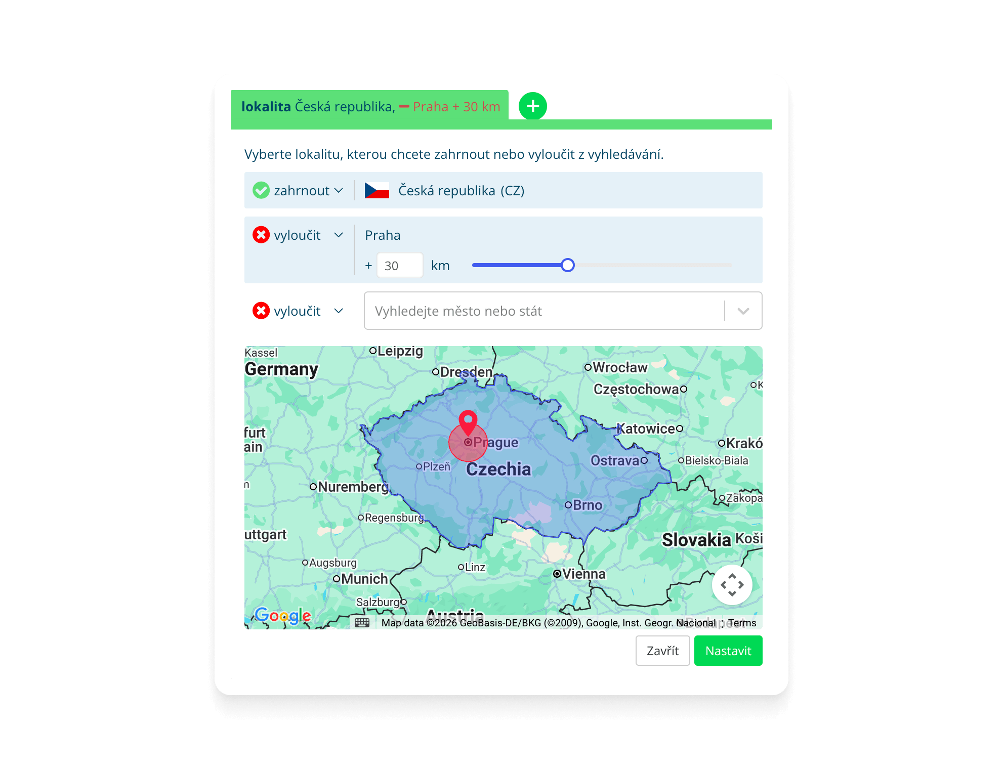 Lokality lze také vyloučit: zahrnete například celou Českou republiku a vyloučíte oblasti, kde máte kamenné prodejny a pro které připravujete jinou kampaň.